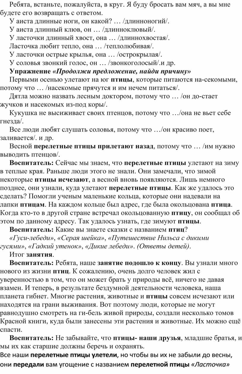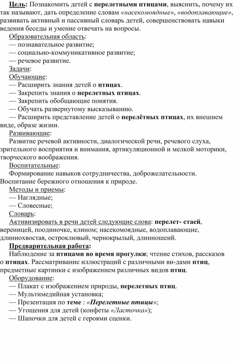 Цель: Познакомить детей с перелетными птицами, выяснить, почему их так называют, дать определение словам «насекомоядные», «водоплавающие», развивать активный и пассивный словарь детей, совершенствовать навыки ведения беседы и умение отвечать на вопросы.