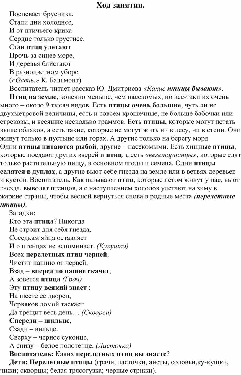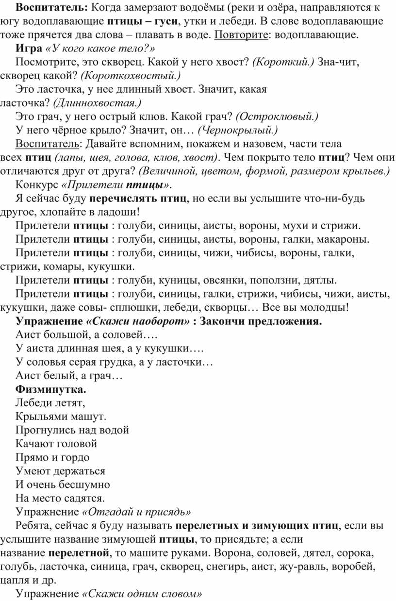 Воспитатель: Давайте вспомним, покажем и назовем, части тела всех птиц (лапы, шея, голова, клюв, хвост). Чем покрыто тело птиц? Чем они отличаются друг от друга? (Величиной, цветом, формой, размером крыльев.)