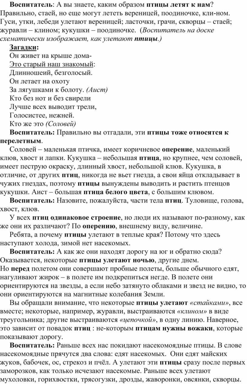 Воспитатель: А как же они находят дорогу на юг и обратно сюда? Оказывается, некоторые птицы улетают ночью, другие днем. Но перед полетом они совершают пробные полеты, больше обычного едят, нагуливают жирок – в полете им подкрепиться негде. В полете они ориентируются на звезды, а если небо затянуто облаками и звезд не видно, то они ориентируются на магнитные колебания Земли.
