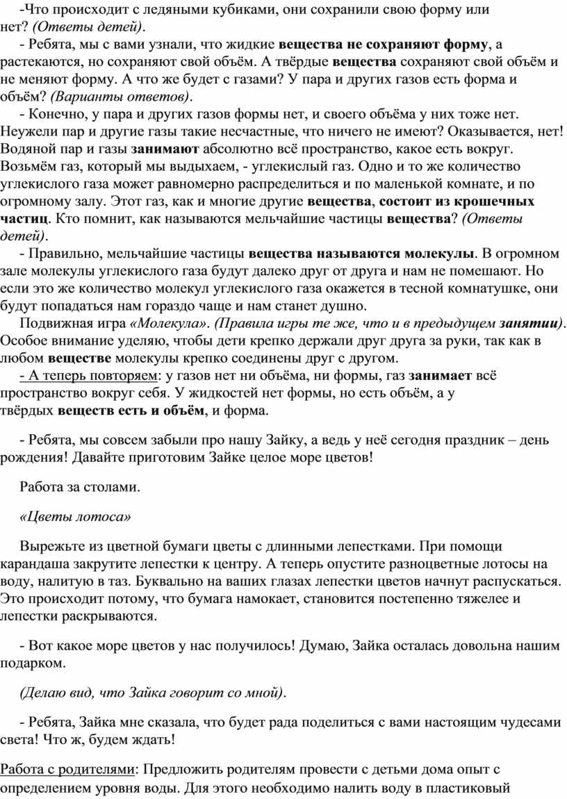 Работа с родителями: Предложить родителям провести с детьми дома опыт с определением уровня воды. Для этого необходимо налить воду в пластиковый стаканчик и пометить фломастером её уровень. Поставить стаканчик в морозильную камеру. Когда вода превратится в лёд, проверить и зарисовать её уровень. Лёд станет выше отметки, потому что вода в твёрдом состоянии имеет больший объём. Затем налить такой же объём воды в кастрюлю, накрыть крышкой и поставить на огонь. Зарисовать, что происходит с водой при кипении. Вода превращается в пар, а пар занимает ещё больше места, чем вода и лёд. Поэтому пар не помещается в кастрюльке, приподнимает крышку и вырывается наружу.