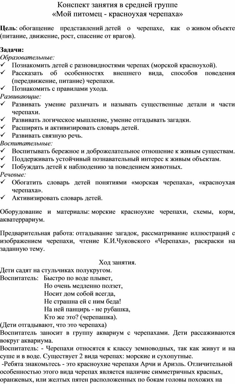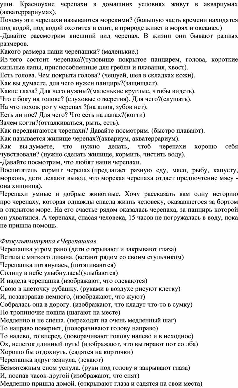 Цель: обогащение представлений детей о черепахе, как о живом объекте (питание, движение, рост, спасение от врагов).