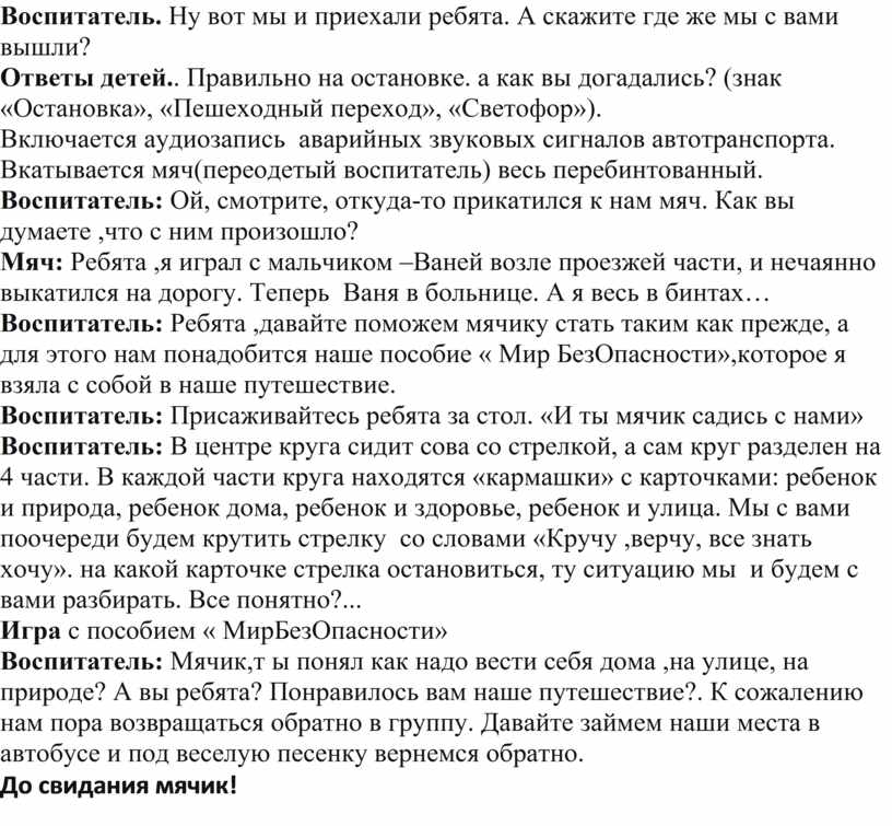 Воспитатель: Мячик,т ы понял как надо вести себя дома ,на улице, на природе? А вы ребята? Понравилось вам наше путешествие?. К сожалению нам пора возвращаться обратно в группу. Давайте займем наши места в автобусе и под веселую песенку вернемся обратно.