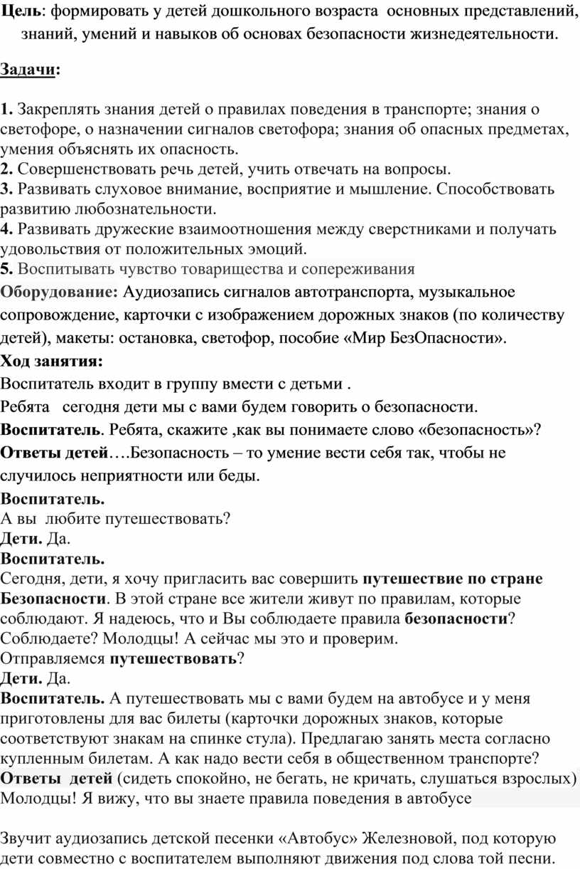 Оборудование: Аудиозапись сигналов автотранспорта, музыкальное сопровождение, карточки с изображением дорожных знаков (по количеству детей), макеты: остановка, светофор, пособие «Мир БезОпасности».