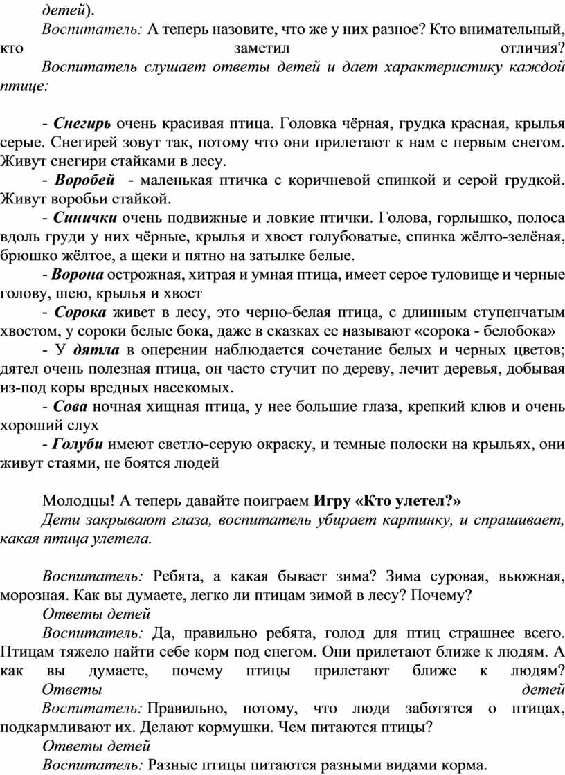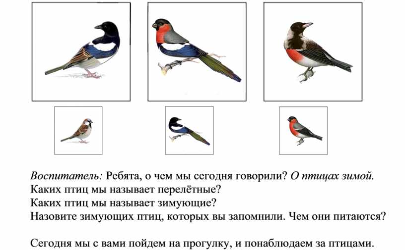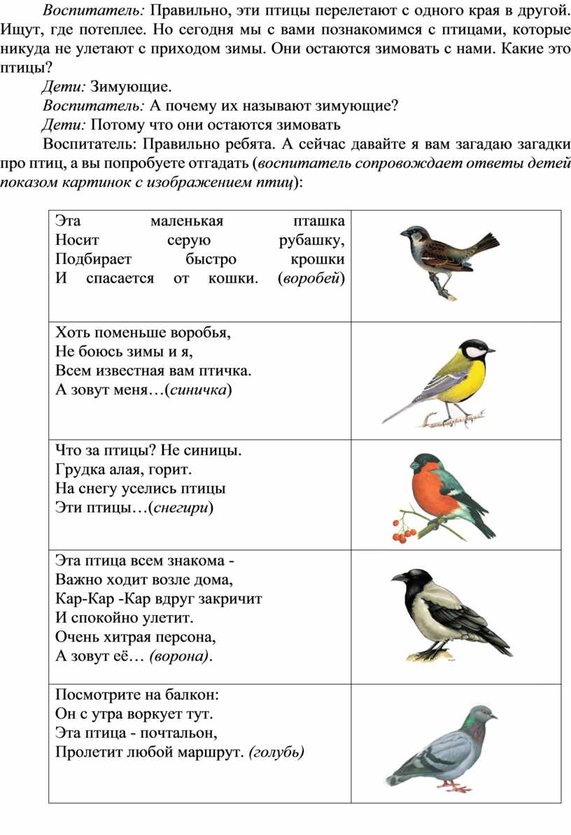Воспитатель: Правильно, эти птицы перелетают с одного края в другой. Ищут, где потеплее. Но сегодня мы с вами познакомимся с птицами, которые никуда не улетают с приходом зимы. Они остаются зимовать с нами. Какие это птицы?