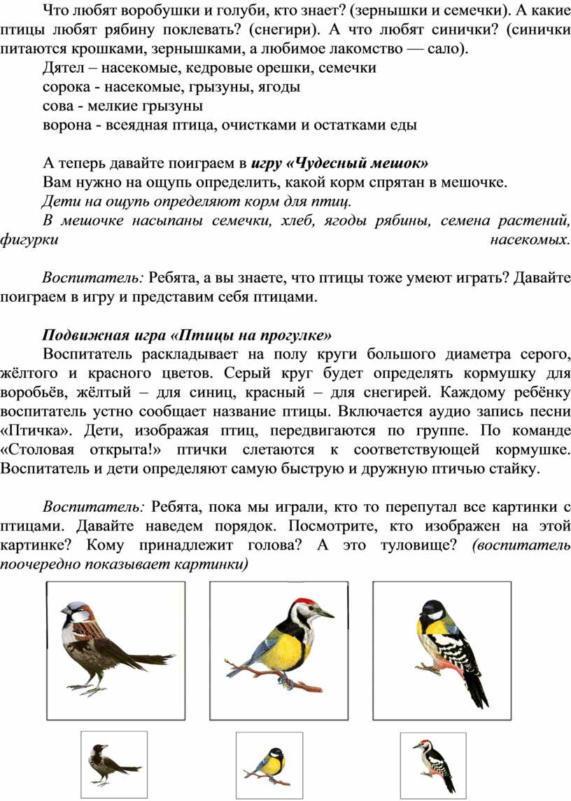 Материалы: Картинки с изображением зимующих птиц (воробей, синица, ворона, сорока, голубь, дятел, сова, сорока); перепутанные картинки с изображением птиц; корм для птиц; фигурки насекомых; мешочек; круги большого диаметра: серый, красный, желтый; диск с записью песни "Птичка".