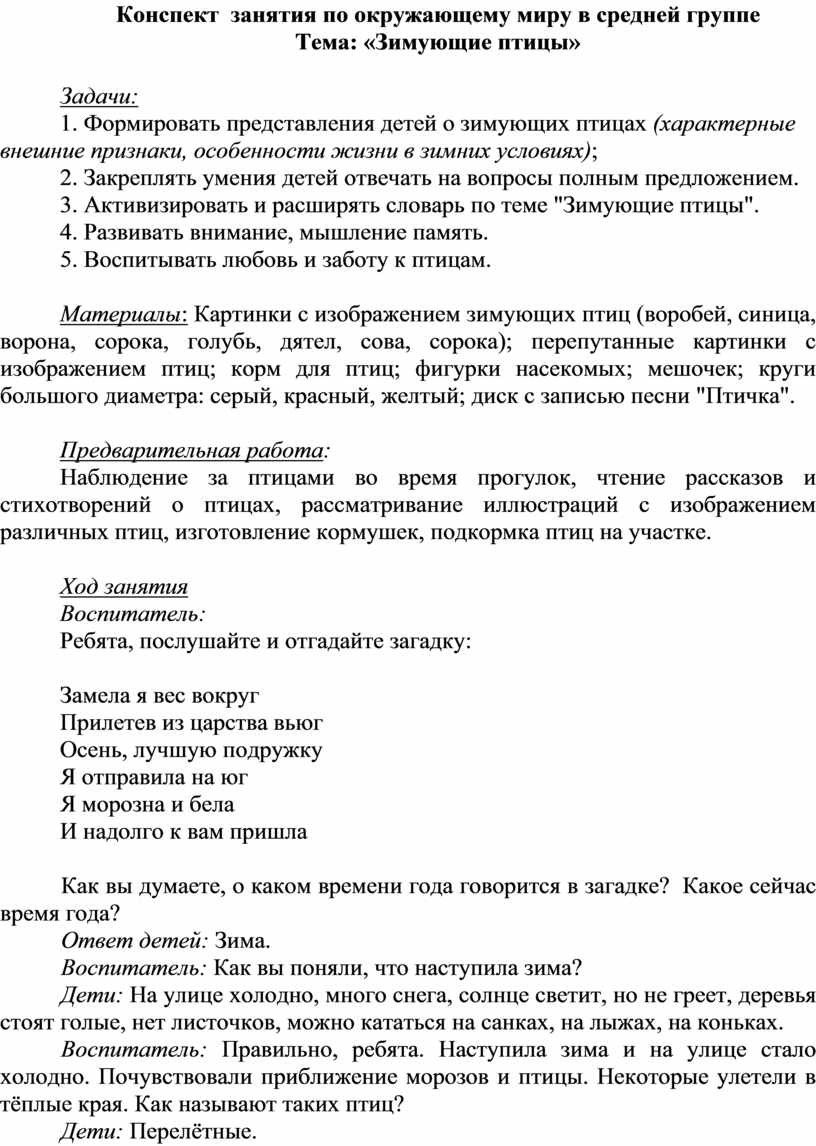 1. Формировать представления детей о зимующих птицах (характерные внешние признаки, особенности жизни в зимних условиях);