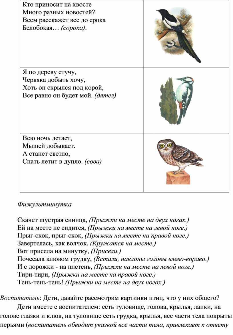 Воспитатель: Правильно ребята. А сейчас давайте я вам загадаю загадки про птиц, а вы попробуете отгадать (воспитатель сопровождает ответы детей показом картинок с изображением птиц):