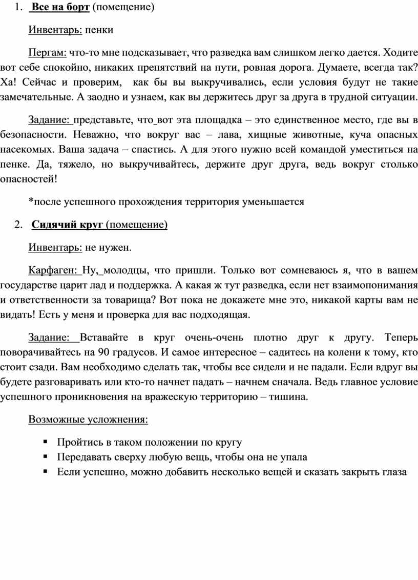 · Если по истечении 4 минут команда не находит решение, вожатый может дать подсказку: посадить девочек на плечи, взять кого-то на руки, прыгать на одной ноге и т.д.