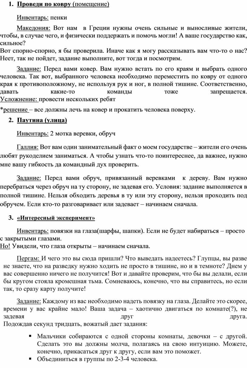Вожатые дают кусочек карты. Допустим: Максим и Ксюша заведуют Галлами, Максим дает одну половину Галлии, Ксюша – другую. У каждого отряда должно быть по две половинки Галлии (и всех остальных государств).