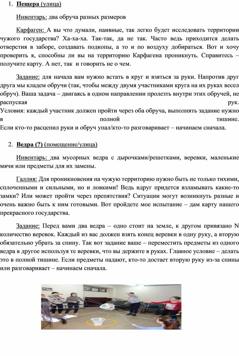 Задание: Перед вами два ведра – одно стоит на земле, к другом привязано N количество веревок. Каждый из вас должен взять конец веревки в одну руку, а вторую обязательно убрать за спину. Так вот задание ваше – переместить предметы из одного ведра в другое используя те веревки, что вы держите в руках. Главное условие – делать это в полной тишине. Если предметы падают, кто-то достает вторую руку из-за спины или разговаривает – начинаем сначала.