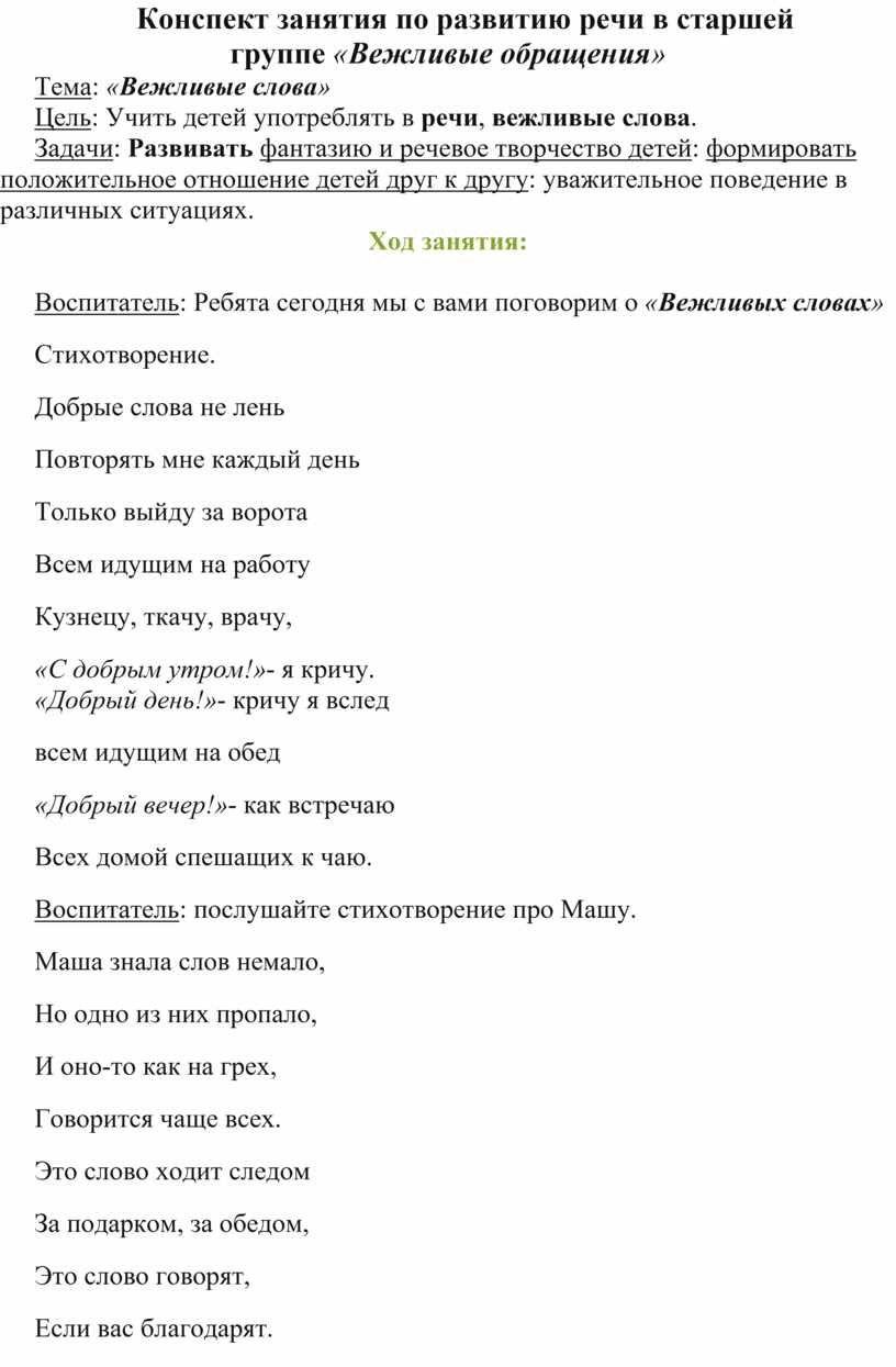 Конспект занятия по развитию речи в старшей группе «Вежливые обращения»
