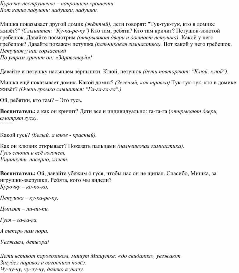 Воспитатель: Ой, давайте убежим о гуся, чтобы нас он не щипал. Спасибо, Мишка, за игрушки-зверушки. Ребята, кого мы видели?