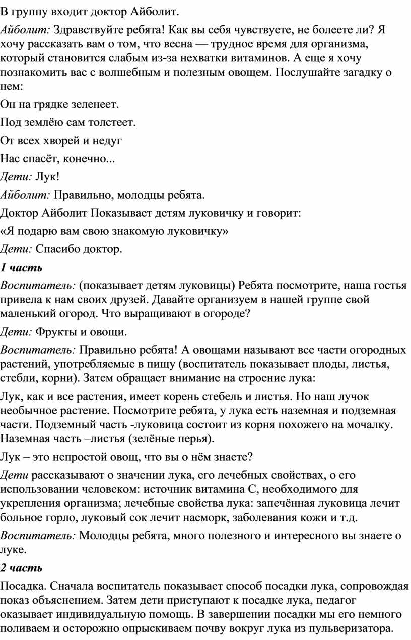 Айболит: Здравствуйте ребята! Как вы себя чувствуете, не болеете ли? Я хочу рассказать вам о том, что весна — трудное время для организма, который становится слабым из-за нехватки витаминов. А еще я хочу познакомить вас с волшебным и полезным овощем. Послушайте загадку о нем:
