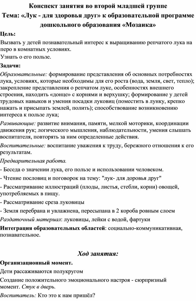 Тема: «Лук - для здоровья друг» к образовательной программе дошкольного