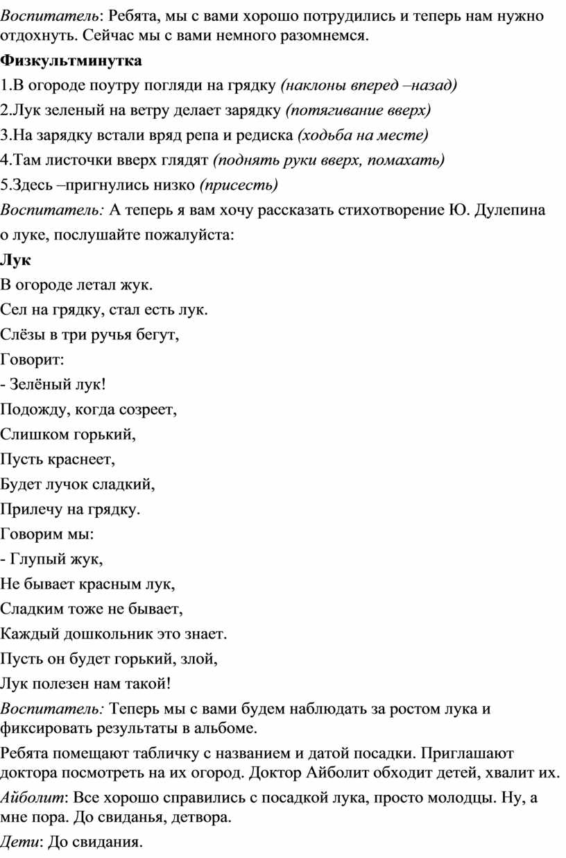 Айболит: Все хорошо справились с посадкой лука, просто молодцы. Ну, а мне пора. До свиданья, детвора.
