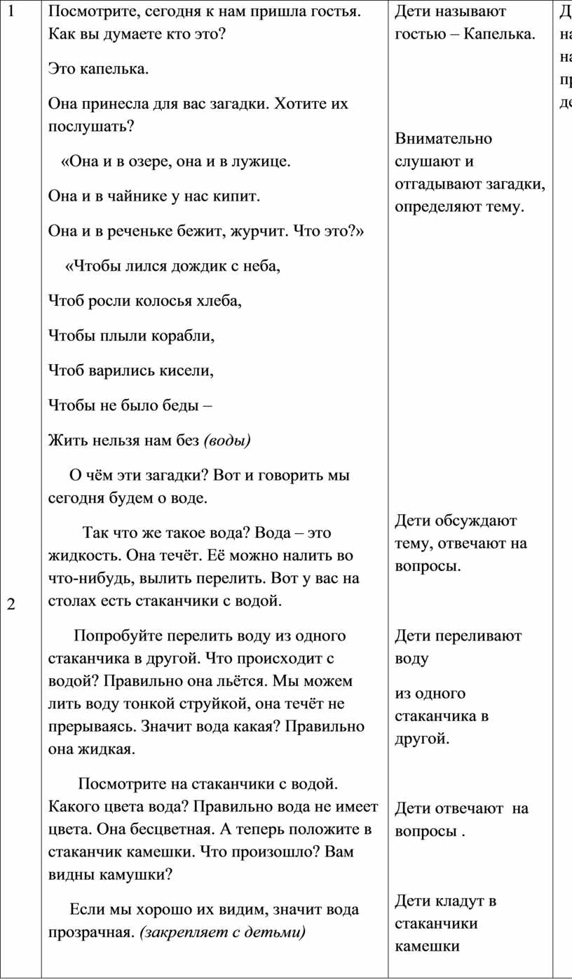 Посмотрите, сегодня к нам пришла гостья. Как вы думаете кто это? Это капелька. Она принесла для вас загадки. Хотите их послушать? «Она и в озере, она и в лужице. Она и в чайнике у нас кипит. Она и в реченьке бежит, журчит. Что это?» «Чтобы лился дождик с неба, Чтоб росли колосья хлеба, Чтобы плыли корабли, Чтоб варились кисели, Чтобы не было беды – Жить нельзя нам без (воды) О чём эти загадки? Вот и говорить мы сегодня будем о воде. Так что же такое вода? Вода – это жидкость. Она течёт. Её можно налить во что-нибудь, вылить перелить. Вот у вас на столах есть стаканчики с водой. Попробуйте перелить воду из одного стаканчика в другой. Что происходит с водой? Правильно она льётся. Мы можем лить воду тонкой струйкой, она течёт не прерываясь. Значит вода какая? Правильно она жидкая. Посмотрите на стаканчики с водой. Какого цвета вода? Правильно вода не имеет цвета. Она бесцветная. А теперь положите в стаканчик камешки. Что произошло? Вам видны камушки? Если мы хорошо их видим, значит вода прозрачная. (закрепляет с детьми) Ребята подойдите сюда к столу. Вот у меня в стаканчике вода, а это что? (краски) Как вы думаете, что произойдёт с водой, если в неё добавить краску? Посмотрим. Что произошло с водой? Правильно она поменяла цвет. Вода не имеет цвета, но её можно легко окрасить в любой цвет. Вода изменяет свой цвет в зависимости от того, что в неё добавлено. Как выдумаете, вода имеет вкус? В стаканчиках есть вода, попробуйте её. Какая она? Вода безвкусная. А можем ли мы изменить вкус воды? Давайте добавим в воду сахар, хорошо перемешайте. Возьмите ложечку и попробуйте воду. Какой вкус стал у воды? Подойдите ко мне. Я добавлю в стаканчик несколько капель лимонного сока. Попробуйте ложечкой воду какой вкус у воды? Значит мы можем по желанию изменять вкус воды. А теперь понюхайте воду. Что вы можете сказать о запахе воды? Правильно вода не имеет запаха. Физминутка. «Дождик капнул на ладошку (правой рукой касаемся левой) На цветы (показывается раскрывание кистей рук, как бутона) И на дорожку (обе руки перед собой) Льётся, льётся, ой-ёй-ёй (покачивание головы) Побежали мы домой (бег на месте) Итак, мы с вами узнали, что вода – это жидкость. Она текучая. Её можно наливать, переливать в разные ёмкости. Вода – бесцветная. Не имеет цвета, но её можно легко окрасить в любой цвет. Ещё вода прозрачная. Вода – безвкусная. Не имеет вкуса. Но вкус воды можно изменить. Вода не имеет запаха. Вода очень важна для каждого человека. Как вы думаете почему? Для чего нам нужна вода? А кто ещё нуждается в воде? Д/игра «Кому нужна вода?» Посмотрите это обруч, а на ковре разложены картинки. Вам нужно выбрать и положить в обруч те картинки, которым нужна вода. Ребята, так кому же нужна вода? Правильно всему живому нужна вода. А что может произойти если не станет воды? Да вода нужна всему живому на Земле. Без воды всё живое погибнет. Поэтому воду надо беречь, правильно и разумно расходовать. А как можно беречь воду Вот сколько интересного мы узнали о воде.