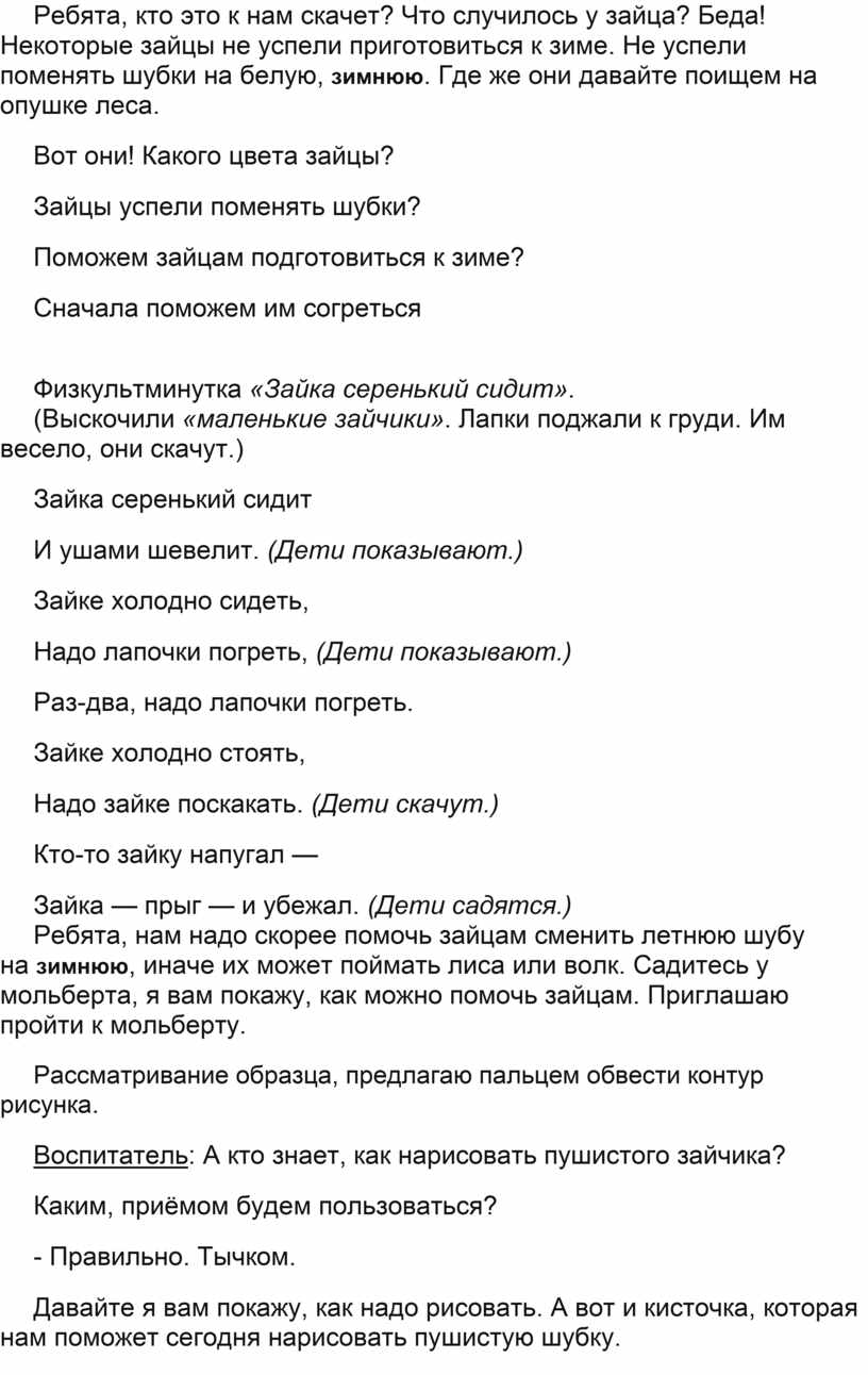 Воспитатель: – Возьмём кисточку, наберём краски чуть – чуть и начнём рисовать. Сначала прорисовываем зайчика – голова, туловище, хвост, лапки, а затем внутри. Тычки ставим близко- близко к друг другу, чтобы шубка получилась густая, тёплая.