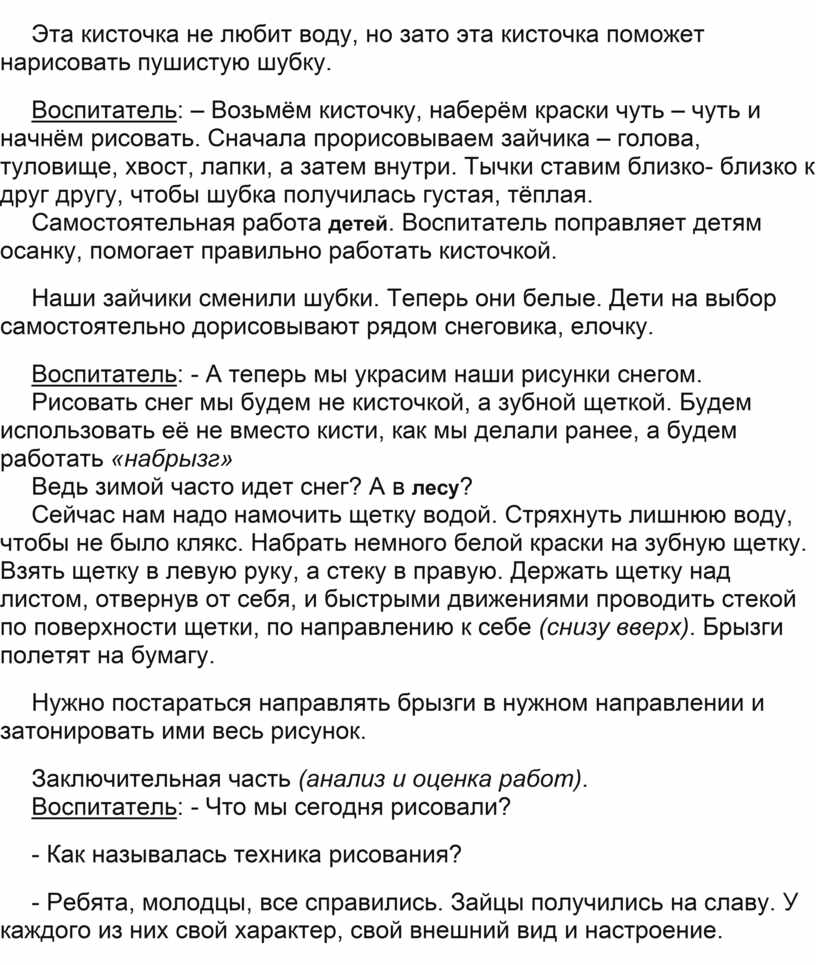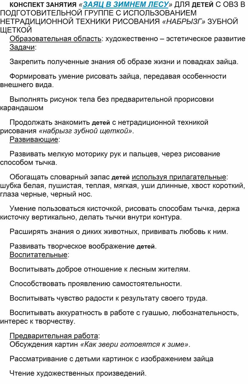 КОНСПЕКТ ЗАНЯТИЯ «ЗАЯЦ В ЗИМНЕМ ЛЕСУ» ДЛЯ ДЕТЕЙ С ОВЗ В ПОДГОТОВИТЕЛЬНОЙ ГРУППЕ С ИСПОЛЬЗОВАНИЕМ НЕТРАДИЦИОННОЙ ТЕХНИКИ РИСОВАНИЯ «НАБРЫЗГ» ЗУБНОЙ ЩЕТКОЙ