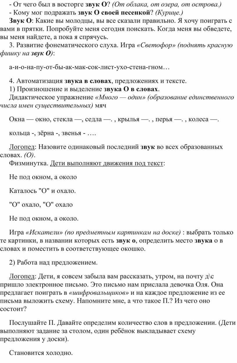 Оборудование: символ звука О, фишки красного цвета, картинки со звуком О (в начале, середине, конце слова, схемы – артикуляции звука и отличия звуков от букв, буква О, домики с тремя окошками, схемы П., листы бумаги с буквами, тетради, карандаши (красный, образец написания буквы О, мяч, су-джок.
