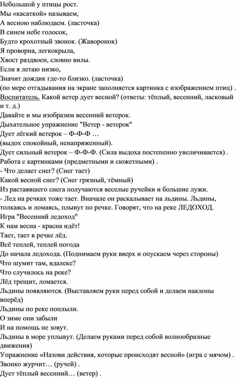 Воспитатель. По народным приметам наступает весна тогда, когда прилетают первые птицы. Какие это птицы? (ответы: перелётные). Какие птицы прилетают к нам весной? (работа со слайдами) .