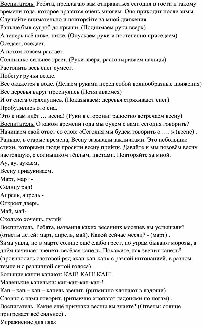 Воспитатель. Ребята, предлагаю вам отправиться сегодня в гости к такому времени года, которое нравится очень многим. Оно приходит после зимы.