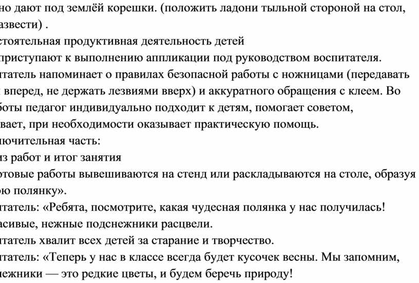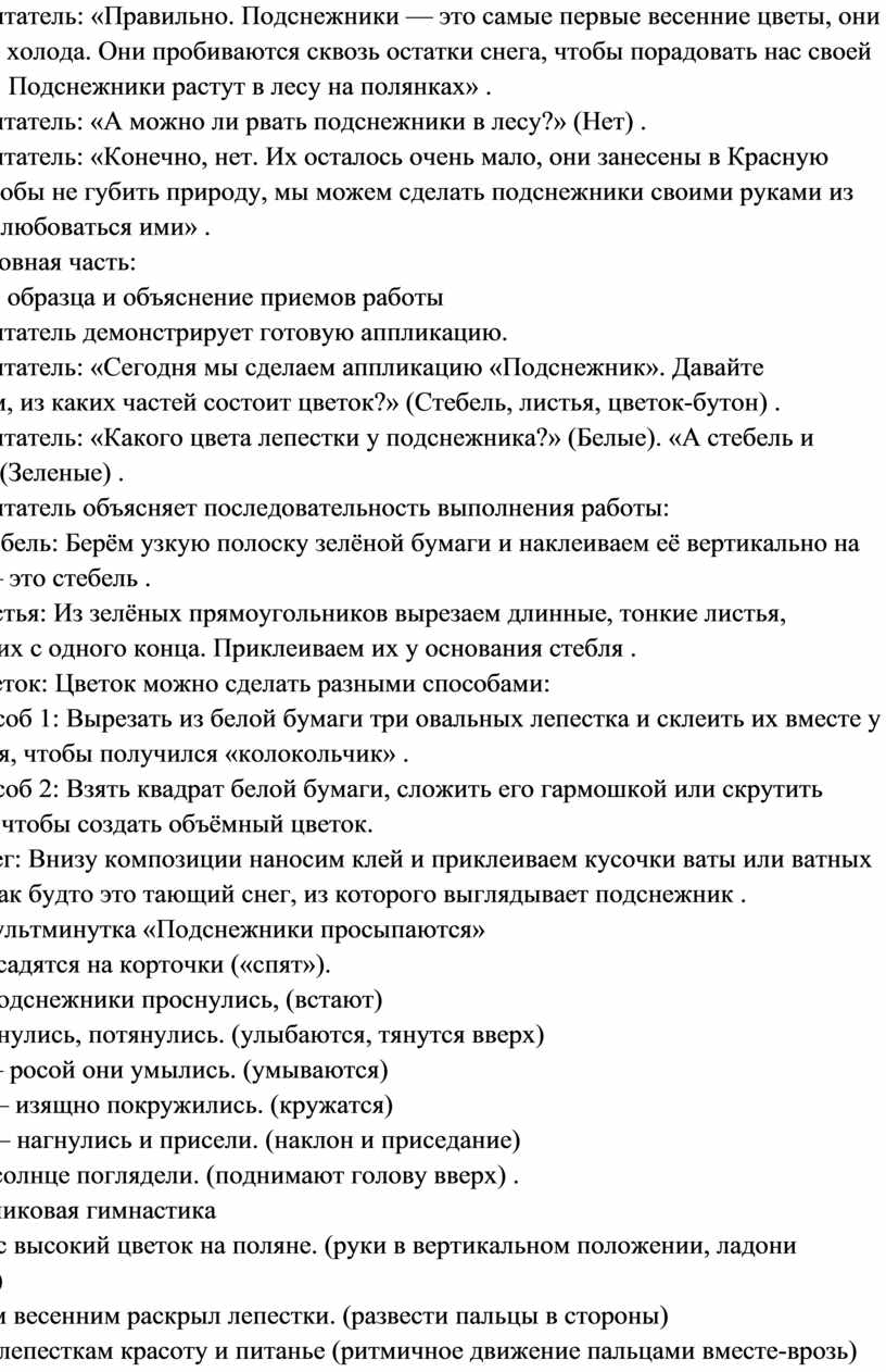 Воспитатель: «Правильно. Подснежники — это самые первые весенние цветы, они не боятся холода. Они пробиваются сквозь остатки снега, чтобы порадовать нас своей красотой. Подснежники растут в лесу на полянках» .