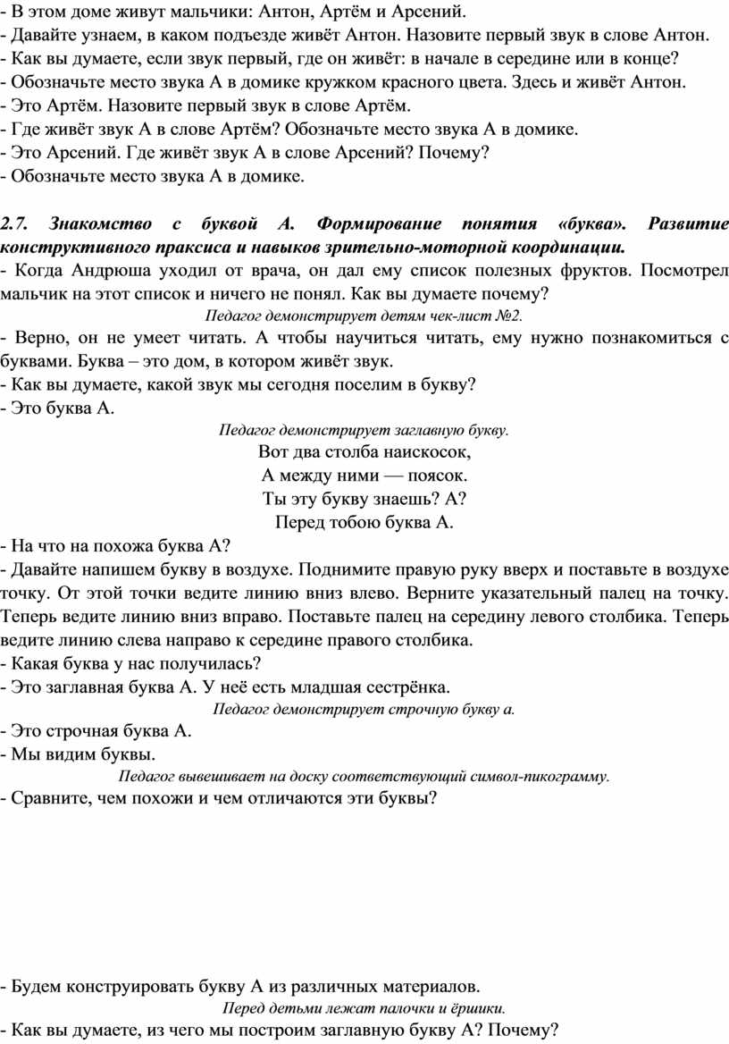 2.7. Знакомство с буквой А. Формирование понятия «буква». Развитие конструктивного праксиса и навыков зрительно-моторной координации. - Когда Андрюша уходил от врача, он дал ему список полезных фруктов. Посмотрел мальчик на этот список и ничего не понял. Как вы думаете почему? Педагог демонстрирует детям чек-лист №2. - Верно, он не умеет читать. А чтобы научиться читать, ему нужно познакомиться с буквами. Буква – это дом, в котором живёт звук. - Как вы думаете, какой звук мы сегодня поселим в букву? - Это буква А. Педагог демонстрирует заглавную букву. Вот два столба наискосок, А между ними — поясок. Ты эту букву знаешь? А? Перед тобою буква А. - На что на похожа буква А? - Давайте напишем букву в воздухе. Поднимите правую руку вверх и поставьте в воздухе точку. От этой точки ведите линию вниз влево. Верните указательный палец на точку. Теперь ведите линию вниз вправо. Поставьте палец на середину левого столбика. Теперь ведите линию слева направо к середине правого столбика. - Какая буква у нас получилась? - Это заглавная буква А. У неё есть младшая сестрёнка. Педагог демонстрирует строчную букву а. - Это строчная буква А. - Мы видим буквы. Педагог вывешивает на доску соответствующий символ-пикограмму. - Сравните, чем похожи и чем отличаются эти буквы?