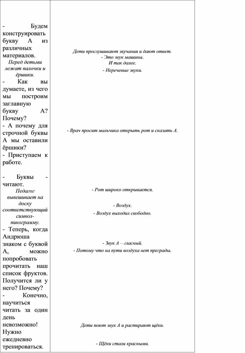 - Правильно, доктор просит мальчика сказать звук А. - Звуки – произносят. Педагог вывешивает соответствующую пиктограмму на доску. - Сегодня мы познакомимся со звуком А и раскроем его секреты. - Посмотрите в зеркало и произнесите звук А. Примечание: при отсутствии индивидуальных зеркал дети смотрят на своего соседа справа или слева. - Обратите внимание, что делает рот, когда мы произносим звук А? - Поднесите ладонь ко рту и произнесите звук А ещё раз. - Что вы почувствовали на ладони? - Воздух проходил свободно или встречал преграду?