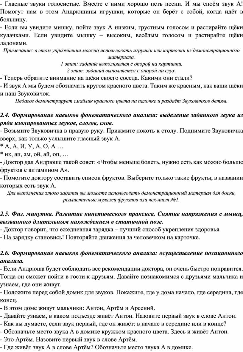 2.6. Формирование навыков фонематического анализа: осуществление позиционного анализа. - Если Андрюша будет соблюдать все рекомендации доктора, он очень быстро поправится. Тогда он сможет пойти в гости к друзьям. Давайте познакомимся с друзьями мальчика и узнаем, где они живут. - Положите перед собой домик для звуков. Покажите, где у дома начало, где середина, где конец. - В этом доме живут мальчики: Антон, Артём и Арсений. - Давайте узнаем, в каком подъезде живёт Антон. Назовите первый звук в слове Антон. - Как вы думаете, если звук первый, где он живёт: в начале в середине или в конце? - Обозначьте место звука А в домике кружком красного цвета. Здесь и живёт Антон. - Это Артём. Назовите первый звук в слове Артём. - Где живёт звук А в слове Артём? Обозначьте место звука А в домике. - Это Арсений. Где живёт звук А в слове Арсений? Почему? - Обозначьте место звука А в домике.