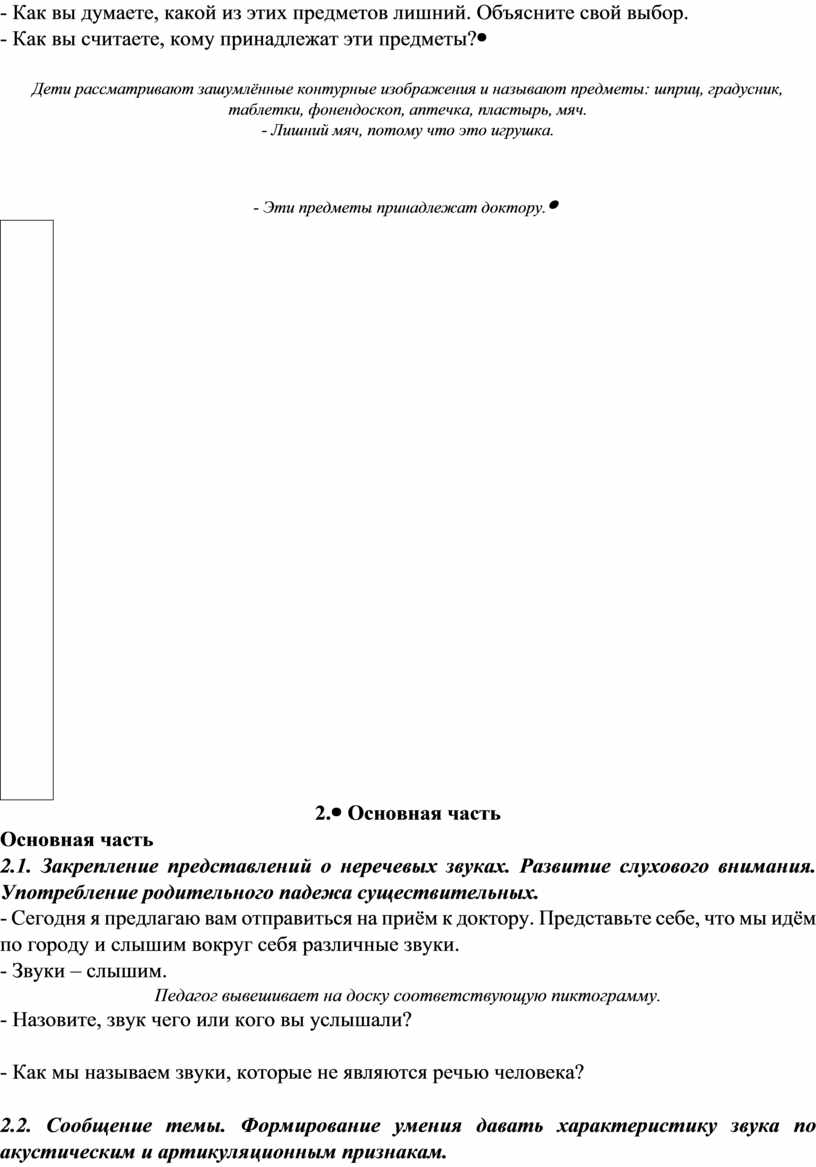 Основная часть 2.1. Закрепление представлений о неречевых звуках. Развитие слухового внимания. Употребление родительного падежа существительных. - Сегодня я предлагаю вам отправиться на приём к доктору. Представьте себе, что мы идём по городу и слышим вокруг себя различные звуки. - Звуки – слышим. Педагог вывешивает на доску соответствующую пиктограмму. - Назовите, звук чего или кого вы услышали?