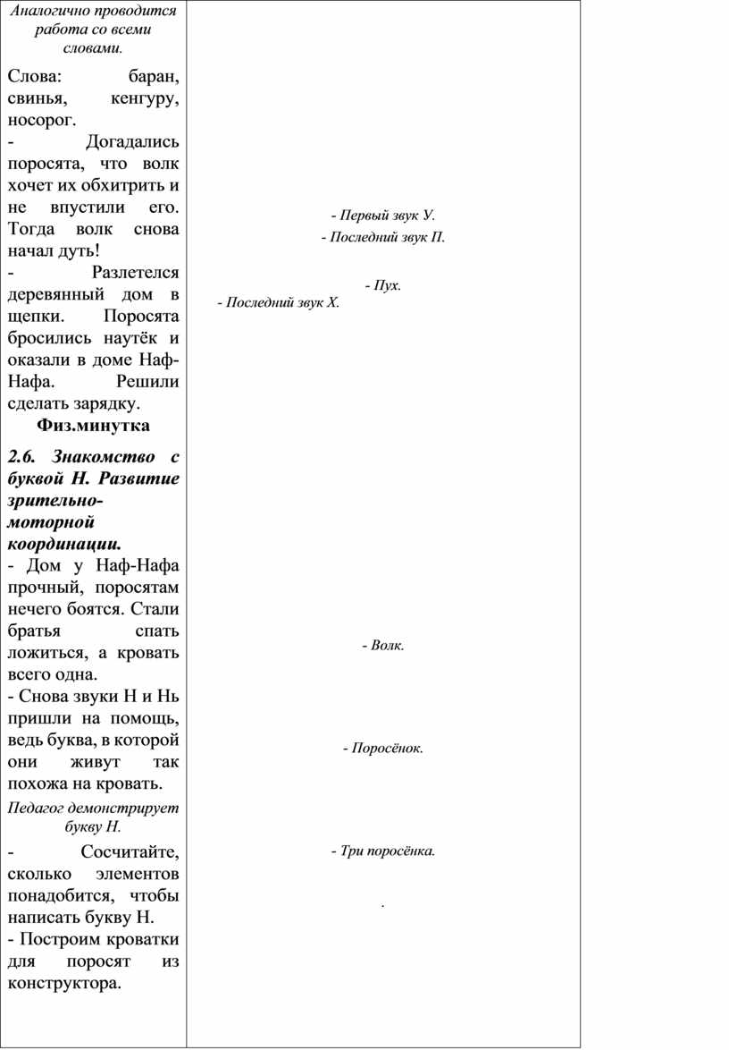 2.6. Знакомство с буквой Н. Развитие зрительно-моторной координации. - Дом у Наф-Нафа прочный, поросятам нечего боятся. Стали братья спать ложиться, а кровать всего одна. - Снова звуки Н и Нь пришли на помощь, ведь буква, в которой они живут так похожа на кровать.