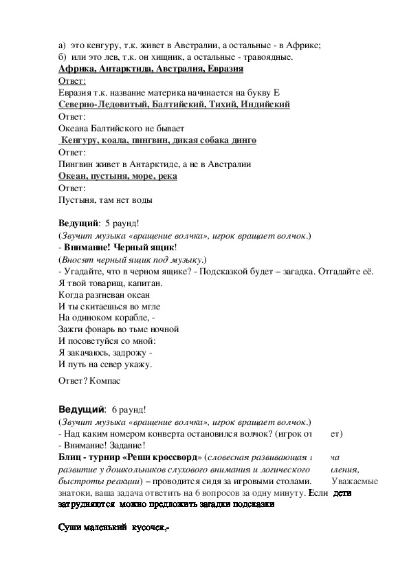 В течении полугода в подготовительной группе проходил проект "Путешествие вокруг света", мы с детьми изучали материки их особенности, интересных животных, своеоразные растения Бкоторые произрастают только в этих местах. изучали как растительный и животный мир приспосабливается к условиям среды. данного материка. итогом наших знаний была игра "Что? Где? Когда?"