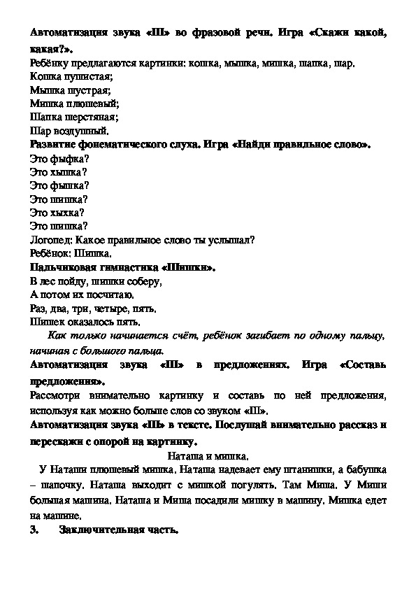 Дидактический материал входящий в занятие позволяет формировать артикуляционную и мелкую моторику; закреплять навык произношения звука «Ш» изолированно, в слогах, словах, фразах, предложениях и текстах; развивать речевое дыхание; формировать навык чтения; развивать фонематическое восприятие; формировать умение пересказывать тексты. Занятие разработано для детей старшего дошкольного возраста с нарушениями в речевом развитии.