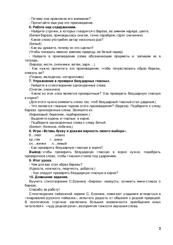 Интегрированный урок русского языка и литературного чтения во 2 классе по произведению Сергея Есенина «Береза» по теме «Упражнение в проверке безударных гласных в корне » направлен на развитие творческих способностей учащихся. Разнообразные задания, используемые на уроке, стимулируют интерес к предмету, развивают мышление учащихся. Конспект урока может быть использован учителями начальных классов по УМК «Школа России».Конспект интегрированного урока русского языка и литературного чтения во 2 классе