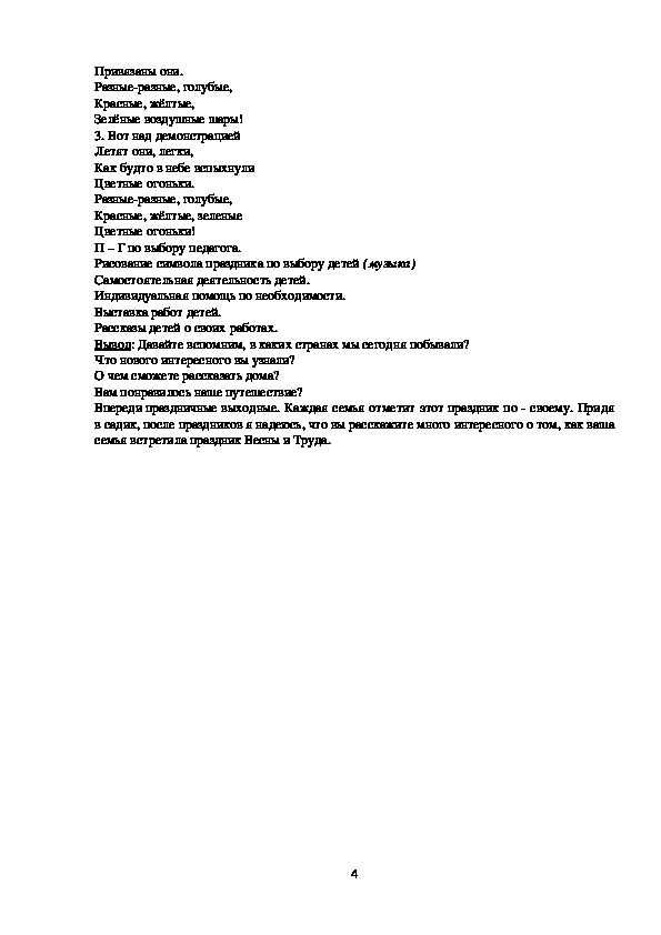 Конспект интегрированного занятия в подготовительной группе «Праздник Весны, Мира и Труда». Конспект занятия для детей подготовительной к школе группы. Содержание материала включает конспект занятия по художественно-эстетическому развитию. Может быть использовано воспитателями дошкольных образовательных учреждений, руководителями изодеятельности и другими. Творческих успехов!Конспект интегрированного занятия в подготовительной группе «Праздник Весны, Мира и Труда»