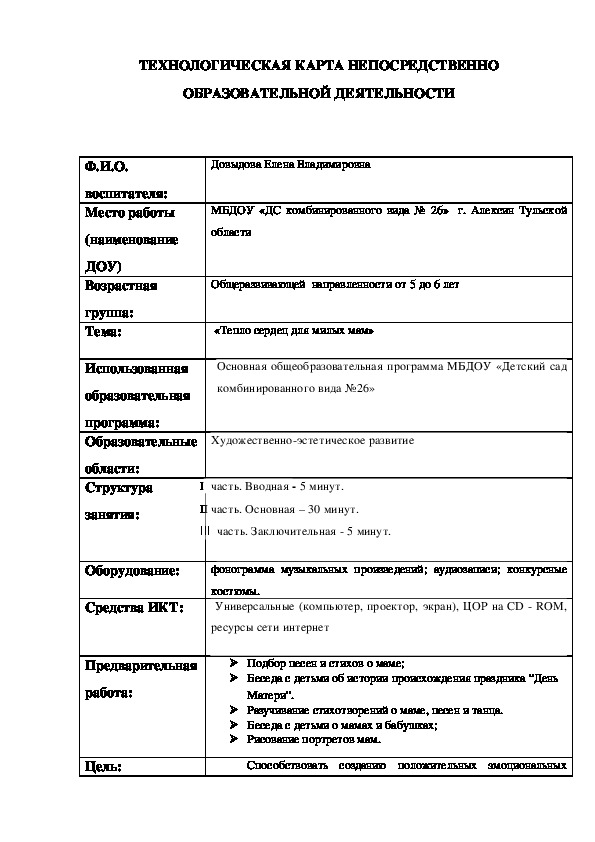 г. АлексинТЕХНОЛОГИЧЕСКАЯ КАРТА НЕПОСРЕДСТВЕННО