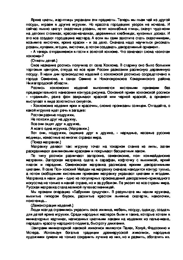 (Показ прялки, кухонной доски.)Яркие цветы, жарптицы украшали эти предметы. Теперь мы пьем чай из другой