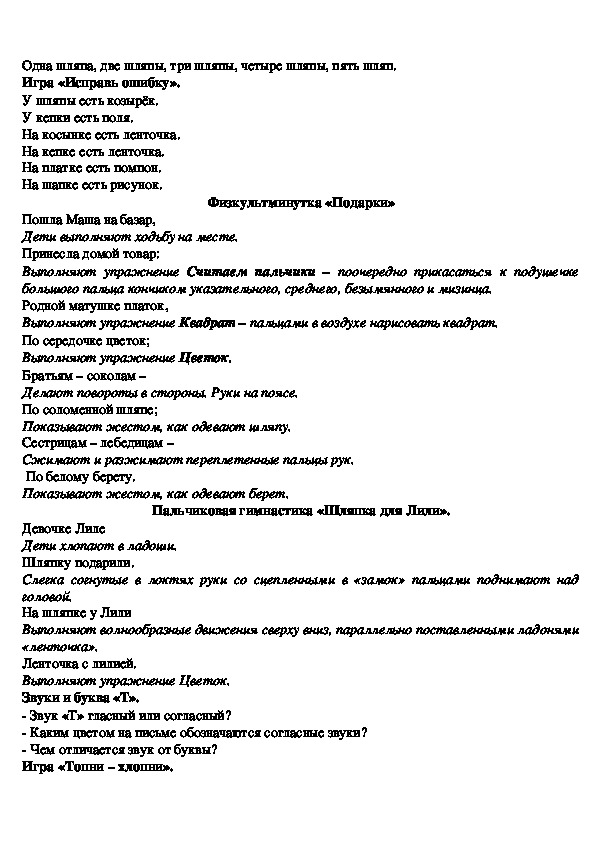 Занятие № 3. Тема: «Головные уборы. Звуки и буква «Т».