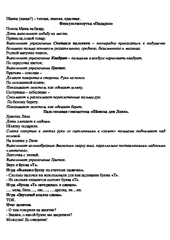 Занятие № 4. Тема: «Головные уборы. Звуки и буква «Т».
