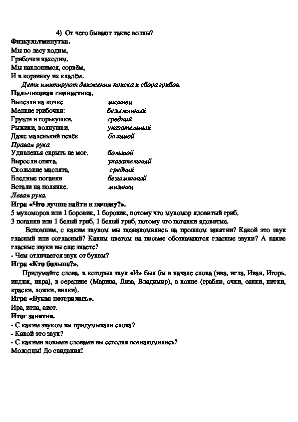 Занятие знакомит с существительными обозначающими грибы, помогает закрепить обобщающее слово «грибы», развивает общую, артикуляционную и мелкую моторику. Позволяет формировать умение пересказывать текст, отвечать на вопросы по содержанию, развивать связную речь, фонематическое восприятие, навыки звуко – буквенного анализа. Занятие предназначено для детей старшего дошкольного возраста.