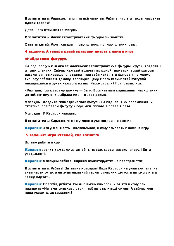 Карлсон находит геометрические фигуры, называет их разными предметами.Воспитатель: Карлсон, ты опять всё напутал. Ребята, что это такое, назовите