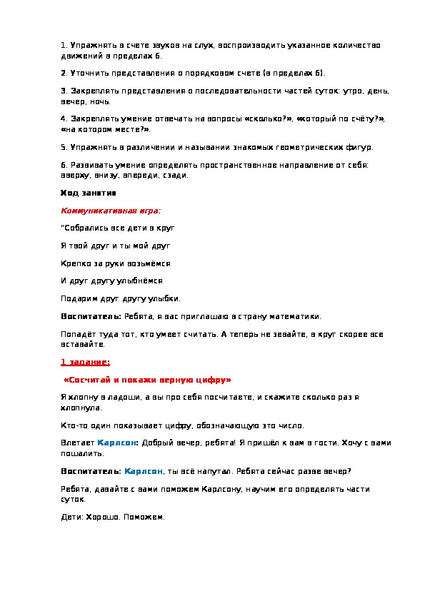 1. Упражнять в счете звуков на слух, воспроизводить указанное количество движений в пределах 6.