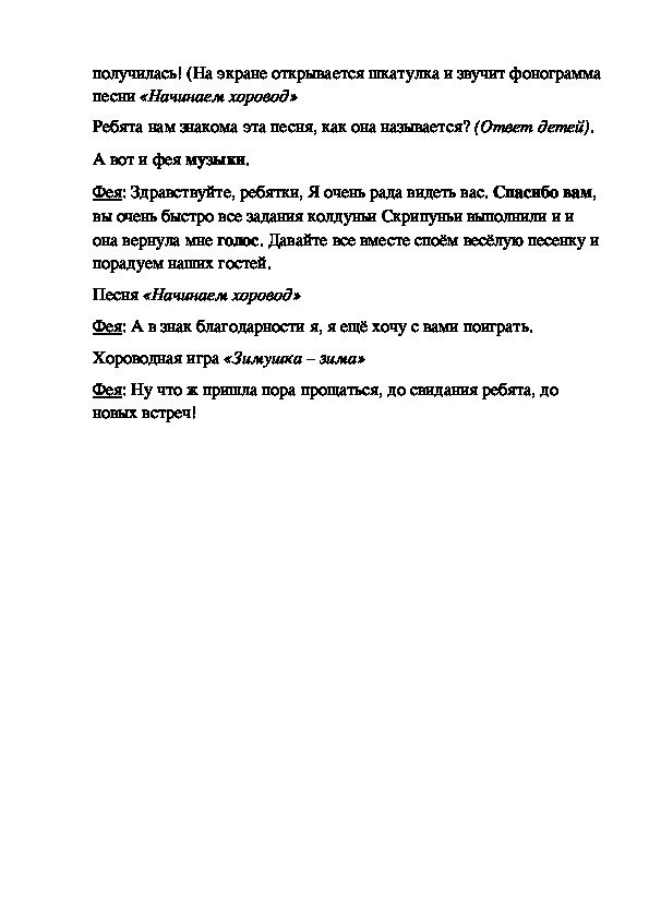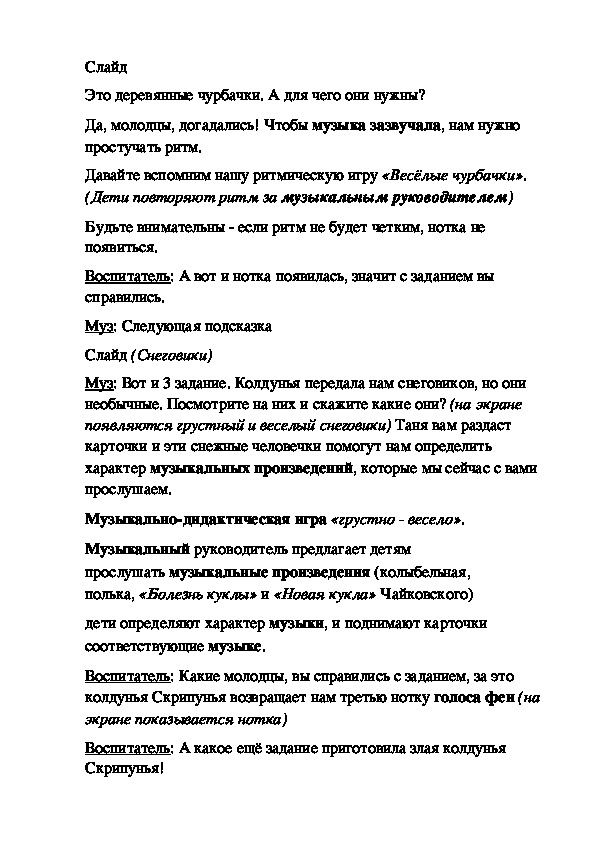 Муз: Правильно, нам нужно собрать все нотки голоса феи, но злая колдунья Скрипунья просто так нам их не отдаст, нам предстоит пройти все её испытания.