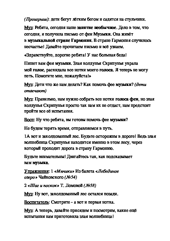 Муз: Ребята, сегодня наше занятие необычное. Дело в том, что сегодня, я получила письмо от феи Музыки. Она живёт в музыкальной стране Гармония. В стране Гармония случилось несчастье! Давайте прочитаем письмо и всё узнаем.