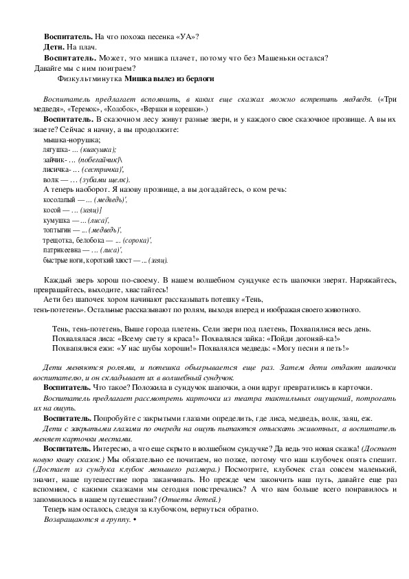 Воспитатель. В сказочном лесу живут разные звери, и у каждого свое сказочное прозвище. А вы их