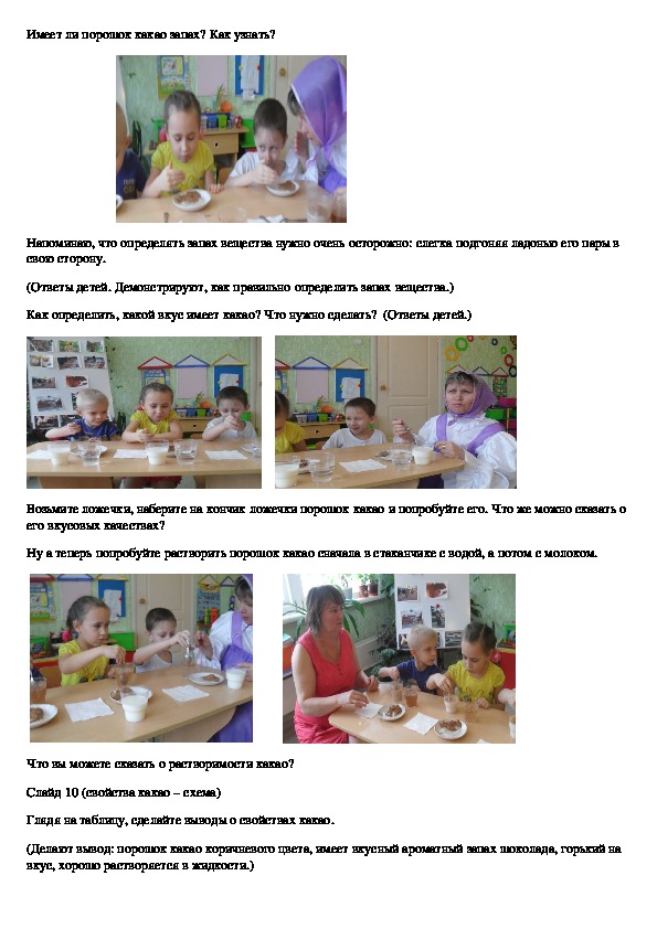 (Делают вывод: порошок какао коричневого цвета, имеет вкусный ароматный запах шоколада, горький на