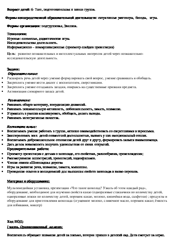 Цель: развитие познавательных и интеллектуальных интересов детей через познавательно-исследовательскую деятельность.• Просмотр презентации с детьми о шоколаде, его свойствах, разнообразии, происхождении;