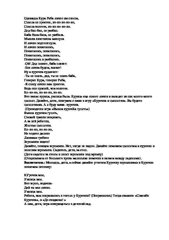 Предварительная работа: чтение русской народной сказки «Курочка ряба»,