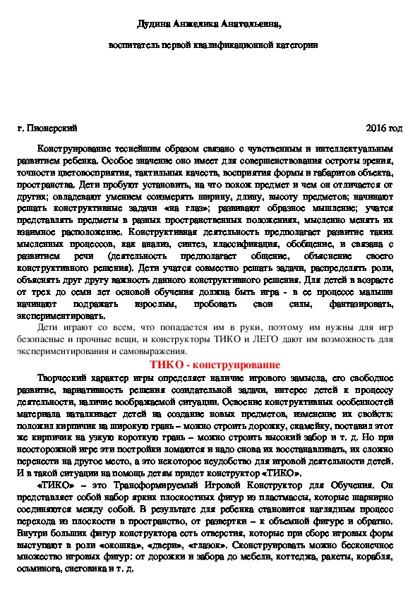 технического творчества дошкольников через ТИКО и ЛЕГО конструирование». Работая