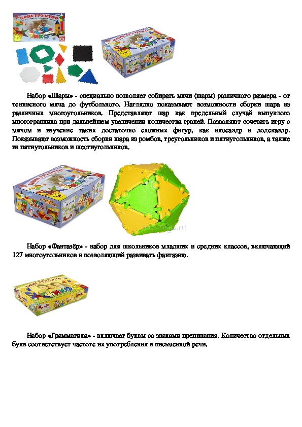 «Геометрия» позволяет составлять орнаменты и паркеты.Набор «Шары» специально позволяет собирать мячи (шары) различного размера от